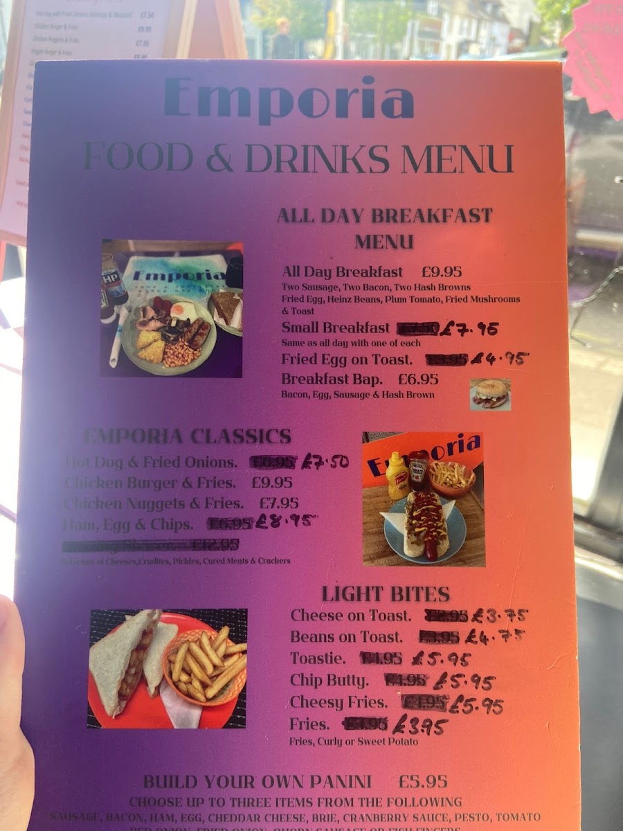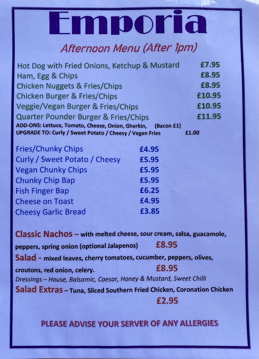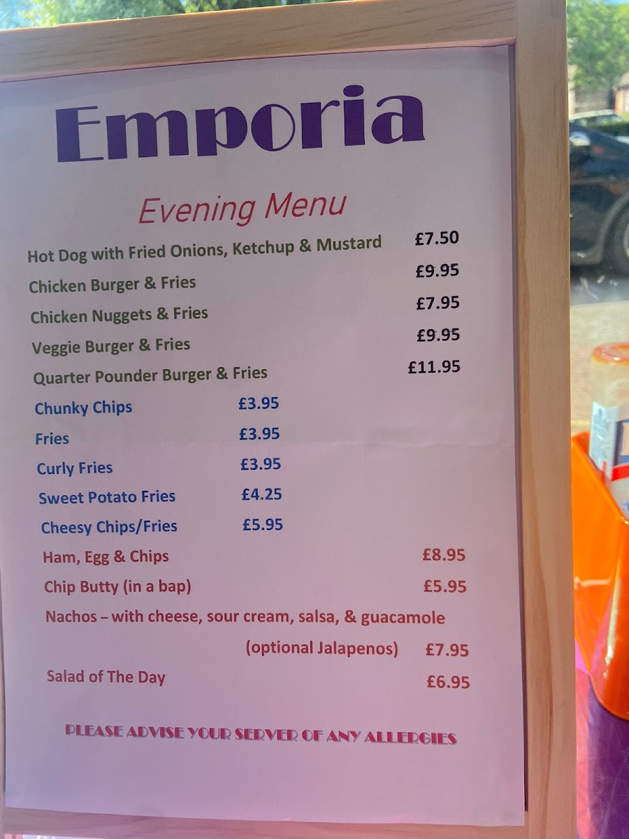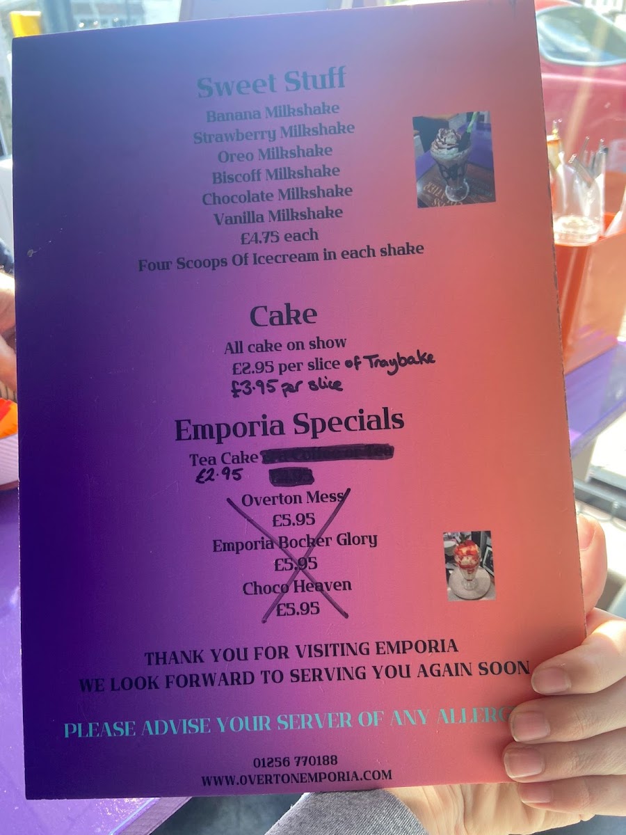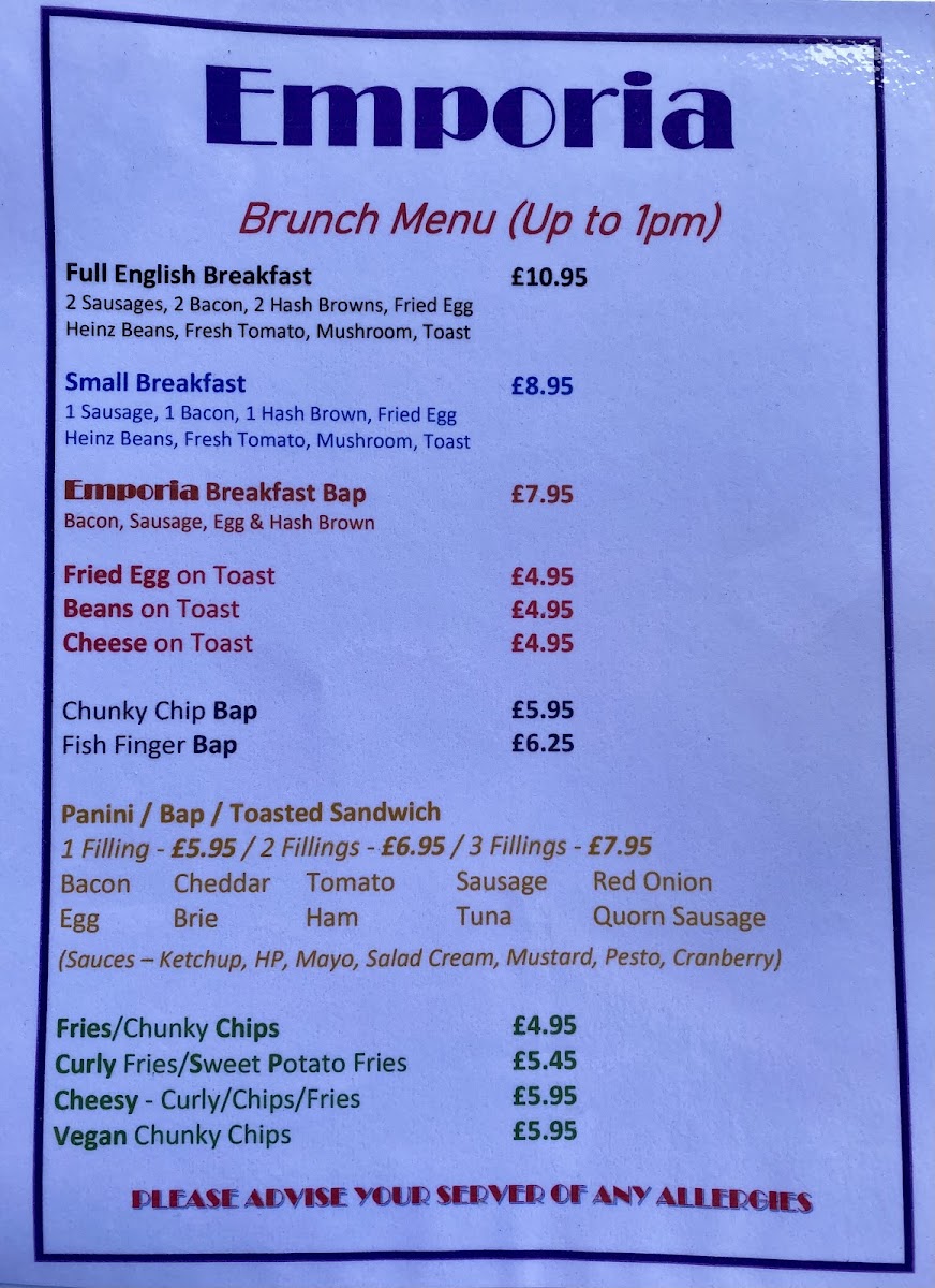 The menu at Emporia Overton features a variety of options suitable for breakfast, lunch, and casual meals throughout the day. It is organized to offer hearty breakfast dishes, light lunch selections, and a range of beverages including specialty shakes and coffee.